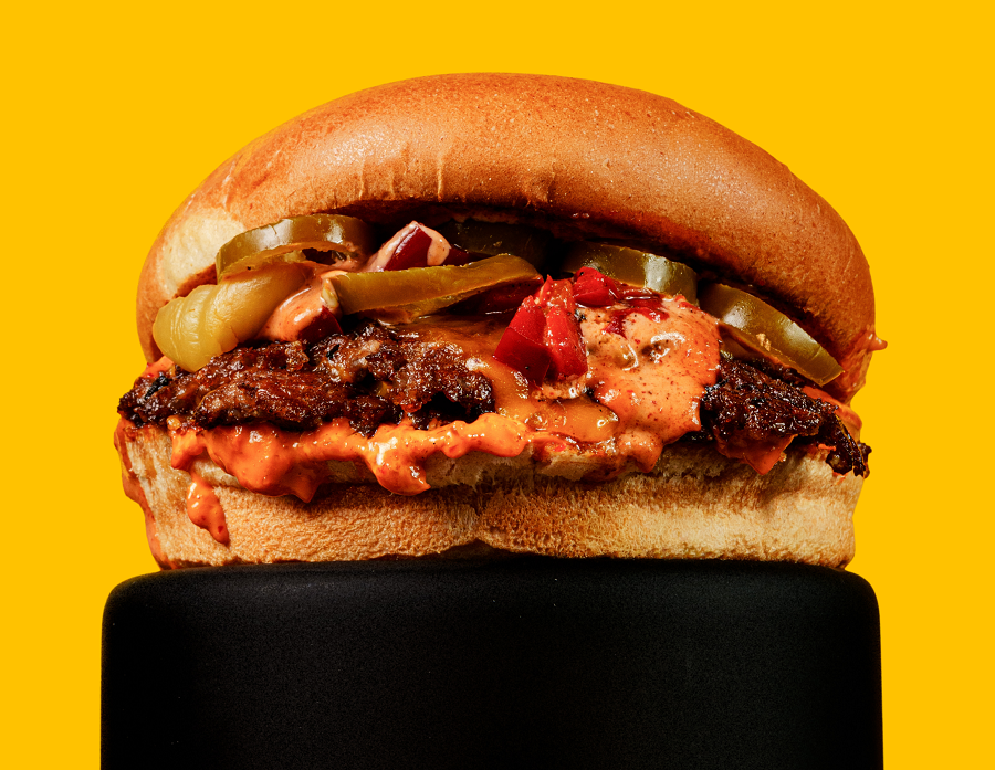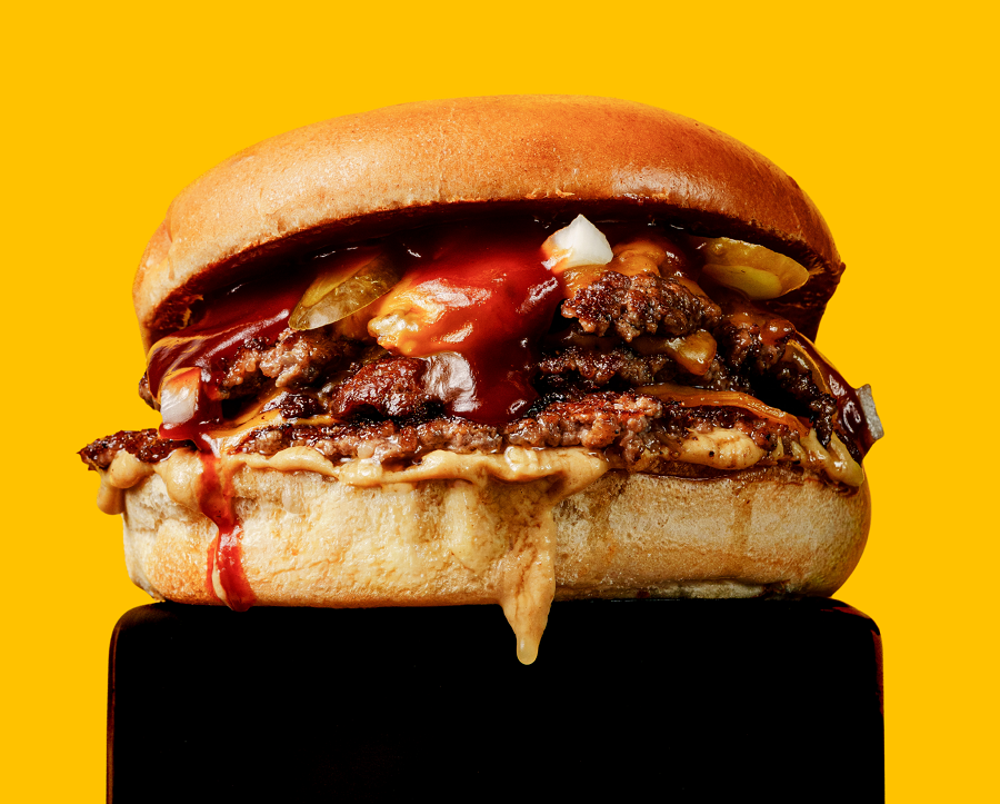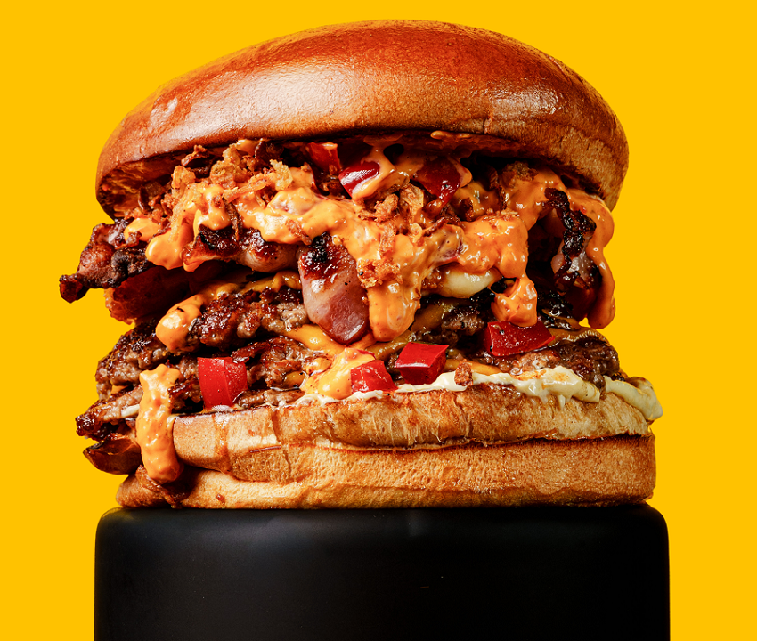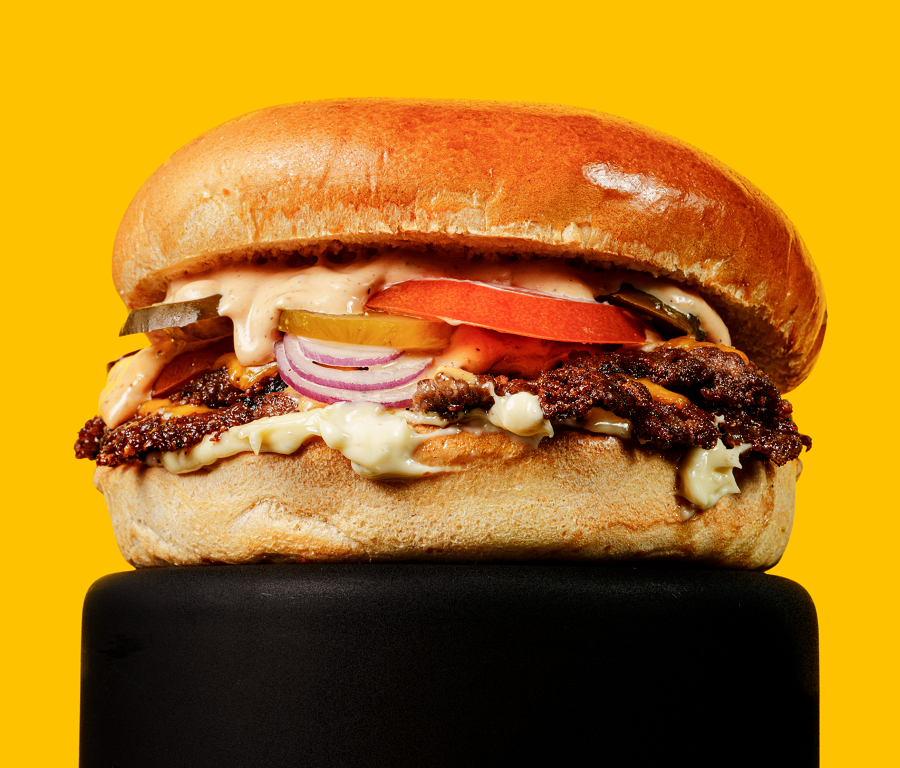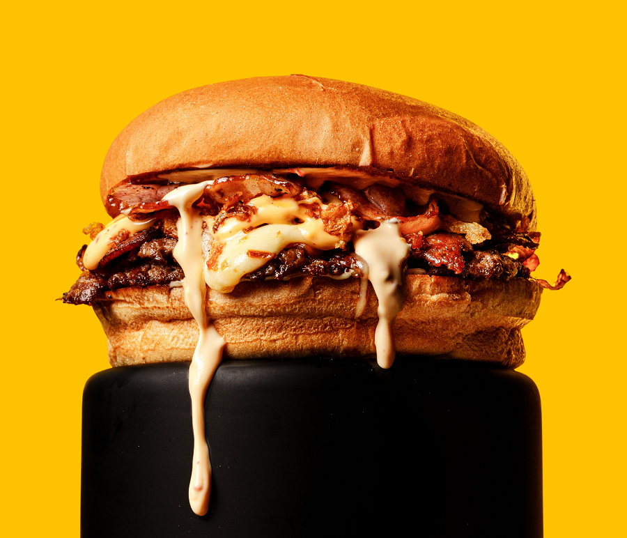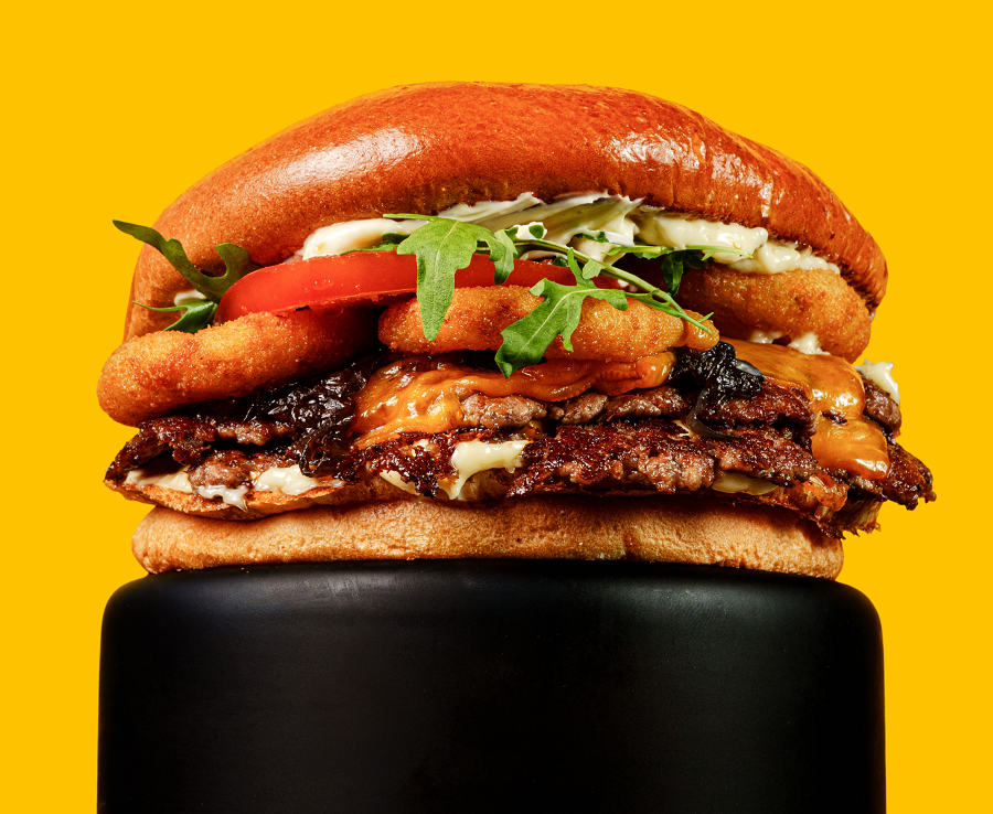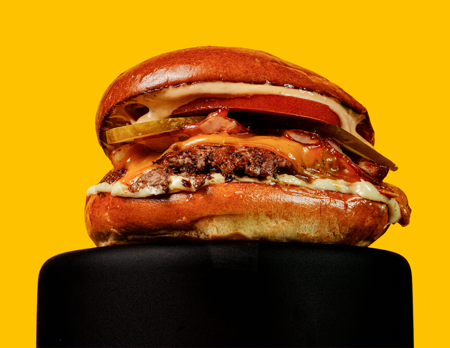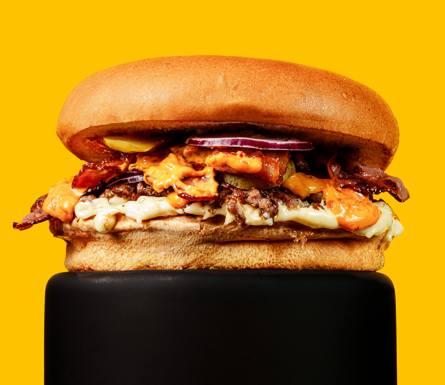 BUŁKA, 100 G WOŁOWINY, CHEDDAR, POMIDOR, BEKON, OGÓREK, SOS BIAŁY I KLASYCZNY